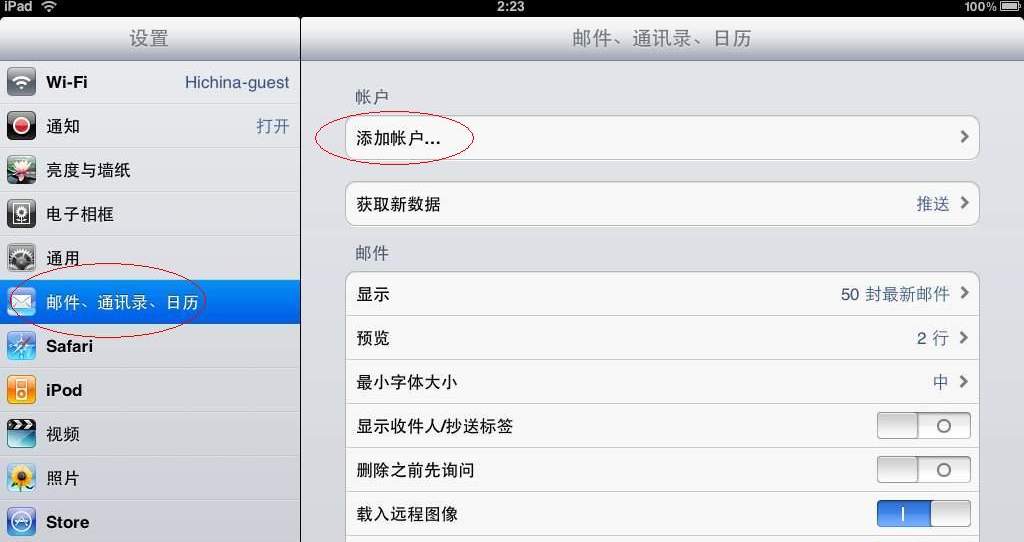 2 選擇“郵件,通訊錄,日歷”,然后選擇“添加賬戶”.
