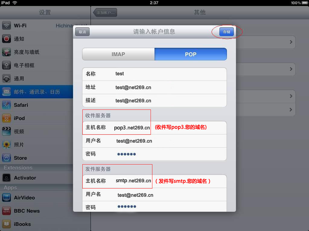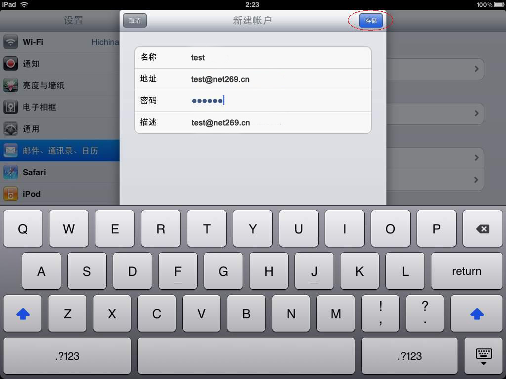 5 然后輸入email地址和密碼,(此處以test@net269.cn為例,您需要將test@net269.cn設置為您自己的email地址,下同)名稱與描述您可以自行定義。輸入完畢之后點擊“存儲”.