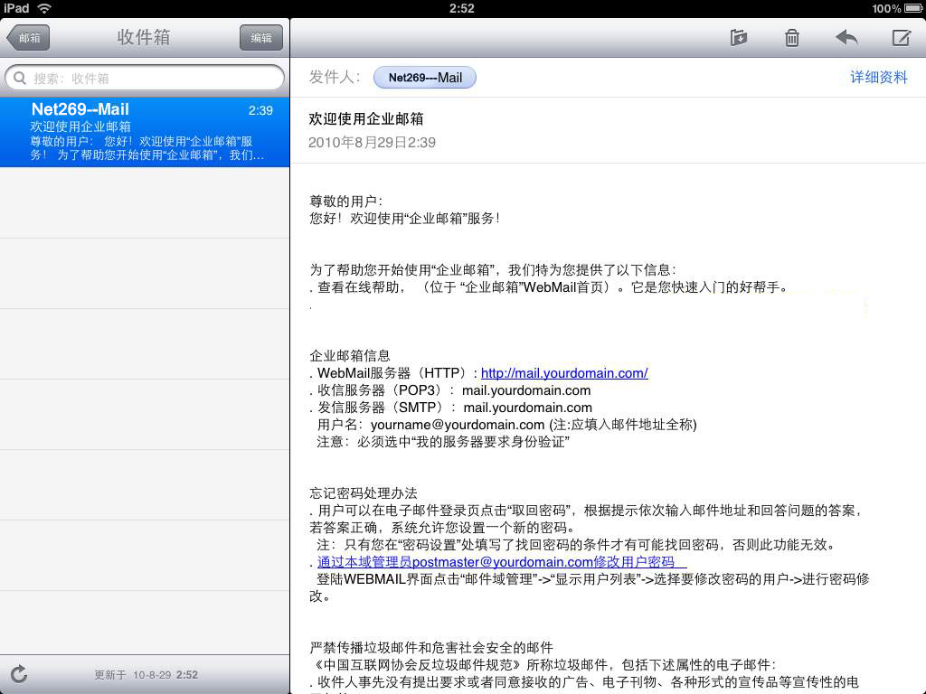 隨著蘋果的手持設備(iPhone、iPad、iTouch等)的銷售火爆,越來越多的269企業(yè)郵箱用戶選擇使用它們來收發(fā)郵件,此處以iPad為例,介紹下如何設置蘋果系統(tǒng)自帶的客戶端軟件(pop方式)。