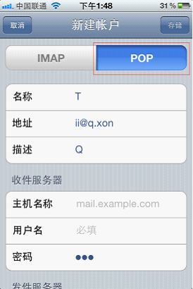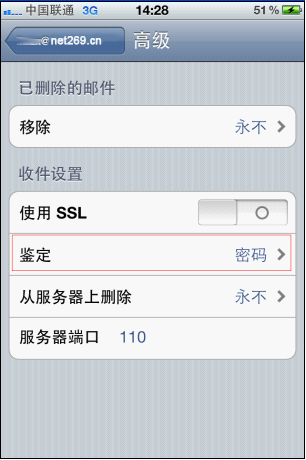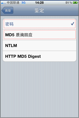 八、iPhone雖然默認(rèn)的鑒定方式是“密碼”,但是實(shí)際上系統(tǒng)中使用apop方式,所以一般用戶(hù)設(shè)定好以后無(wú)法使用,可以先改變一種鑒定方式(如MD5等)并確定,再選回“密碼”方式,此時(shí)的iPhone就可以正常使用了。