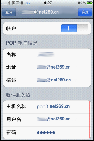 四、收件服務(wù)器中設(shè)置您的郵件服務(wù)器,賬號(hào)和密碼,郵件服務(wù)器您可以填寫(xiě)“pop3.net269.cn”(也可以填寫(xiě)pop3.您的域名,視您是否做得高級(jí)解析決定的):